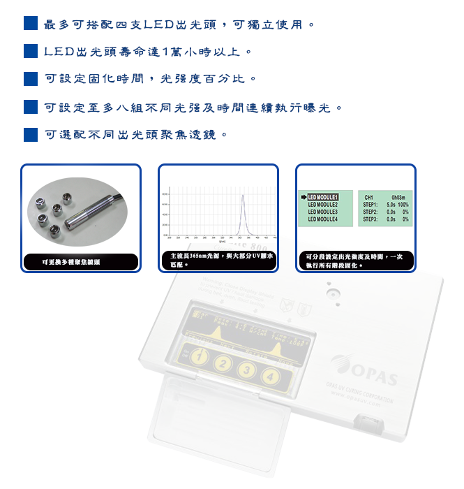 * UV照度量測值是以3mm導管與照度計距離10mm高度 條件所測得,照度計為OPAS XLite 800-UVA